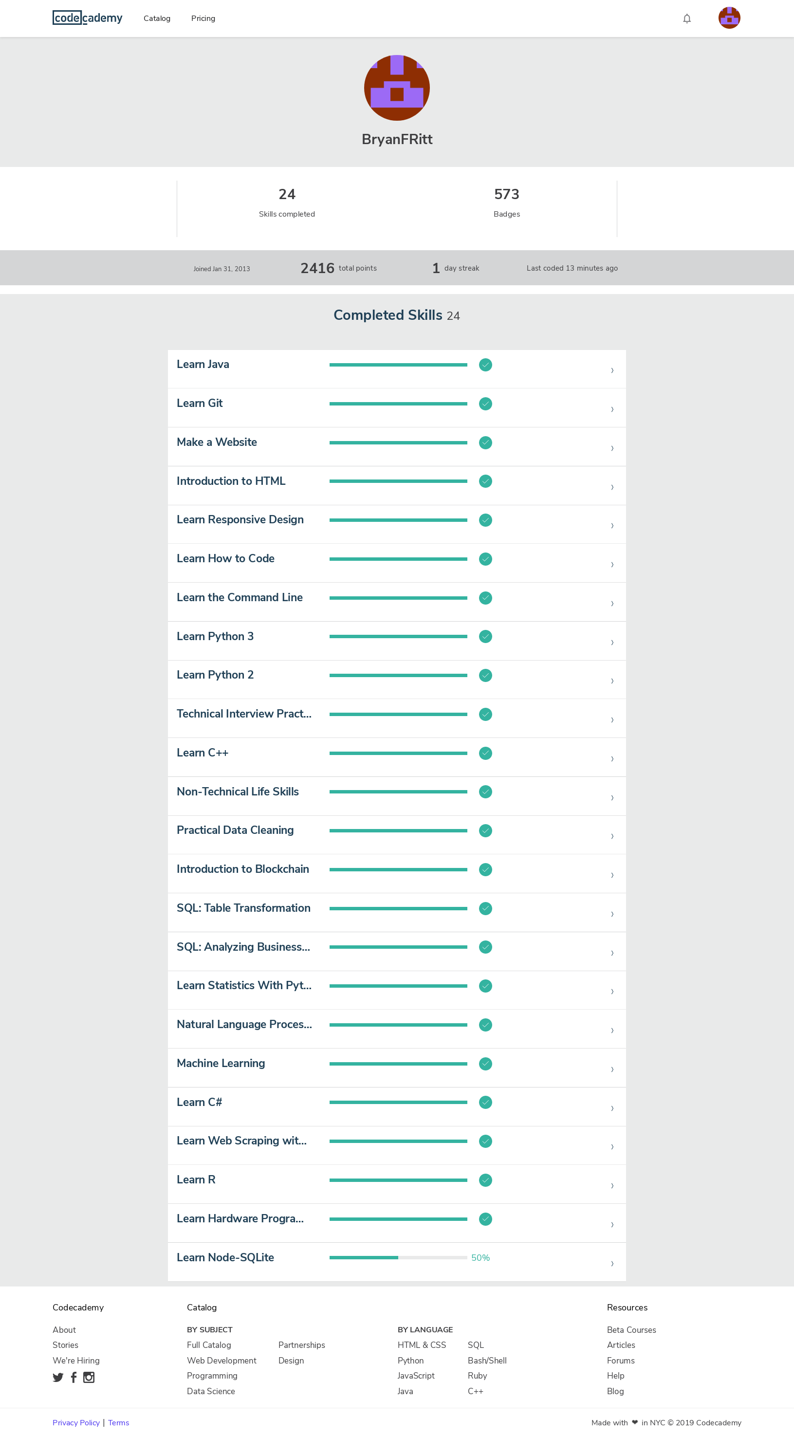 (Note: Currently shows some uncompleted courses as well. Screenshots are unedited, and since taking these screenshots I've completed the Introduction to JavaScript, Learn CSS, and D3 courses)